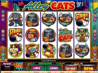 Alley Cats Slots es una slot machine de 5 rodillos y 9 líneas que permite apostar hasta 20 monedas por línea. Quien elige de jugar casino con esta tragaperras será transportado en un mundo de simpáticos gatos de la calle, bien reproducido en una grafica realmente excelente, que contribuye a que este juego sea aún más interesante.