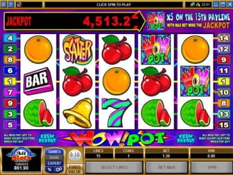 Para ganar el jackpot progresivo de esta slot machine es necesario alinear cinco símbolos jolly, representado por una coloradísima escrita “wowpot!”, en la decimoquinta línea. El símbolo jolly puede sustituir cualquier otro símbolo para alinear una de las doce combinaciones ganadoras y permite ganar hasta 5000 monedad alineando 5 símbolos jolly desde la primera hasta la decimocuarta línea.